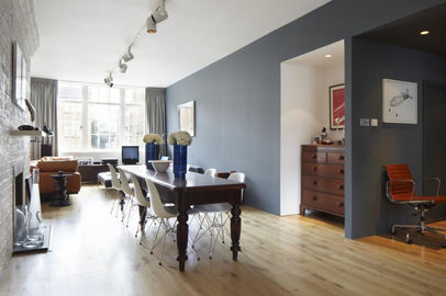 After 17 years living in Banner Street, Christopher and James have given the apartment an upgrade. The new kitchen is made of Rosewood with a corian worktop, while silk wall paper and grey painted joinery are used to create a new library room.